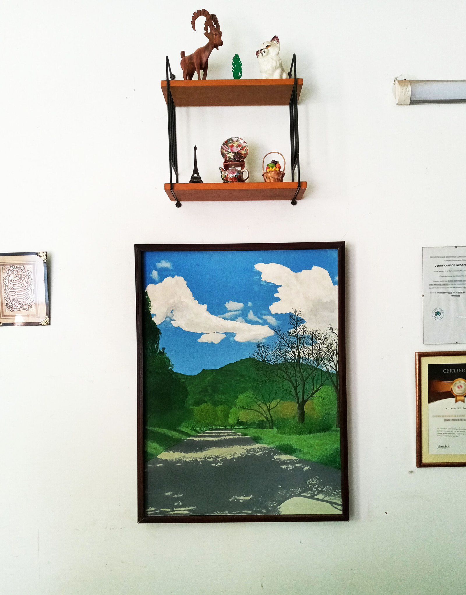 Adding to the painting’s allure is its depiction of the scenic hills of Margalla Hills National Park, located in Islamabad, Pakistan’s capital city. These famous hills, embraced by the warm afternoon light, provide a serene backdrop to the avenue. The juxtaposition of the towering hills and the avenue’s plastic carpeted ground creates a modern yet timeless panorama, a visual homage to the coexistence of urban and natural beauty within Islamabad.